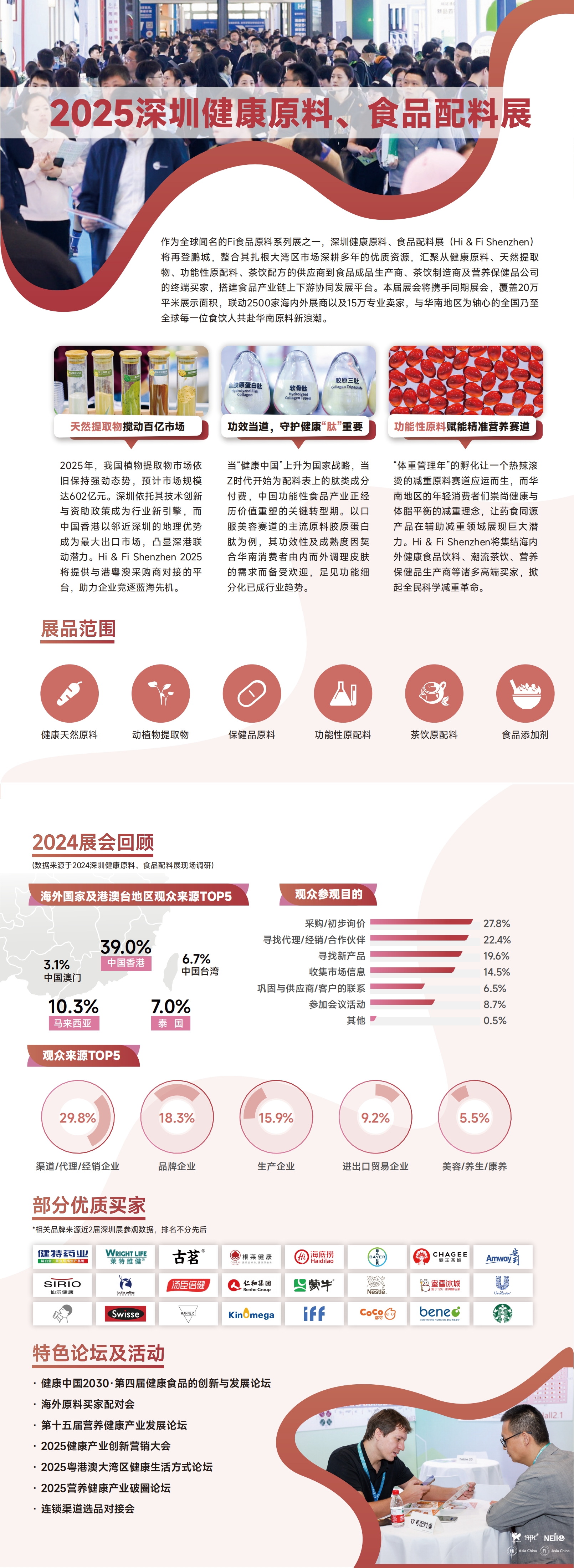 全球知名的食品原料系列展深圳站——“深圳健康原料、食品配料展”将再次亮相深圳,此次展会是Hi & Fi Asia-China上海展的延伸与拓展,也是多年广州展累积的华南市场资源的体现,届时将汇聚健康原料、天然原料、天然提取物、功能性原 料配、茶饮原配料、食品添加剂等优质供应商齐聚—堂,为华南地区的健康食品饮料、潮流茶饮、营养保健品生产商以及功能性食品原配料批发商和分销商在内的诸多专业买家提供全新解决方案。