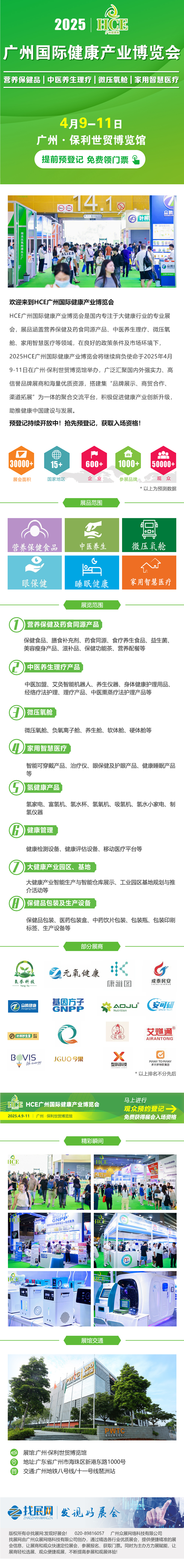 HCE2025广州健康展将于4月9日至11日在广州保利世贸博览馆举办,展会全称广州国际健康产业博览会。HCE2025广州健康展展品涵盖营养保健品、微(高)压氧舱、氢健康产品、中医养生理疗、家用智慧医疗等领域,汇聚国内外众多实力品牌展商,打造一个融合品牌展示、商贸合作与渠道拓展的综合性交流平台,为企业探寻新市场方向提供高效的学习契机。积极推动健康产业的创新升级,助力健康中国建设与发展。