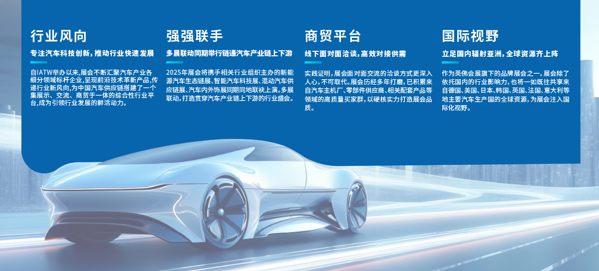 2025年展会将携手相关行业组织主办的新能源汽车生态链展、智能汽车科技展、混动汽车供应链展、汽车内外饰展同期同地联袂上演。多展联动,打造贯穿汽车产业链上下游的行业盛会。