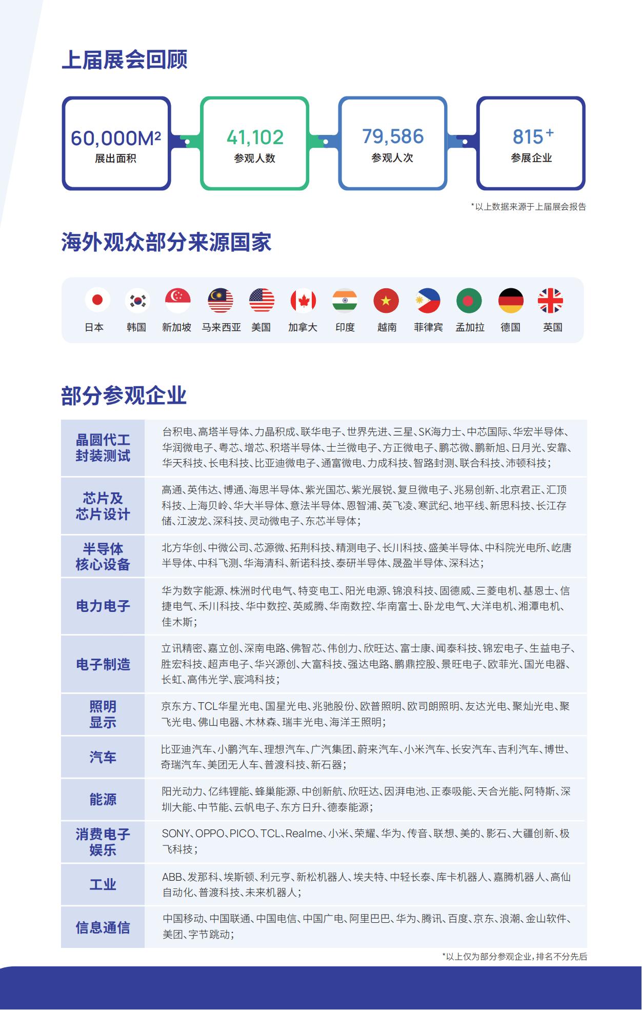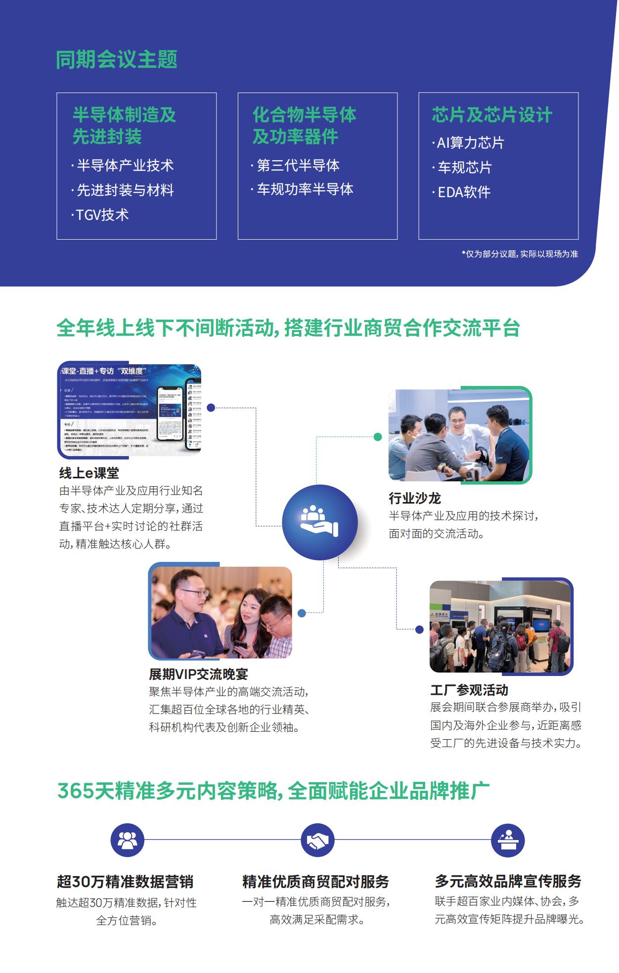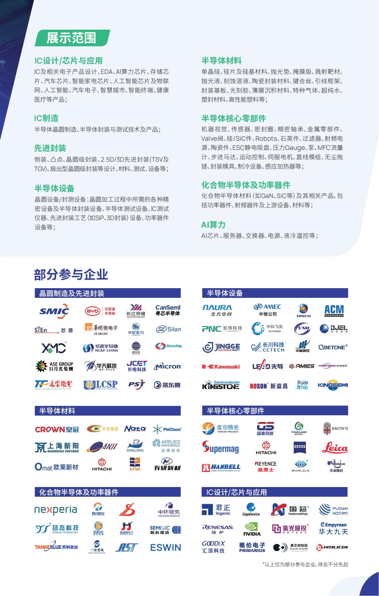 展会覆盖终端、设计、制造、封测、设备、材料、EDA/IP、零部件的全产业链生态,为此特设前道制造、封装测试、装备、材料及零部件等IC制造与供应链专区;汽车电子芯片、智能穿戴芯片、工业控制芯片、通信芯片、安全芯片、计算芯片、传感芯片以及EDA/IP等IC设计与应用专区;功率器件、化合物半导体材料、化合物半导体设备等化合物半导体专区等展示主题,展出面积达6万平方米,全面展示集成电路产业最新技术与成果。