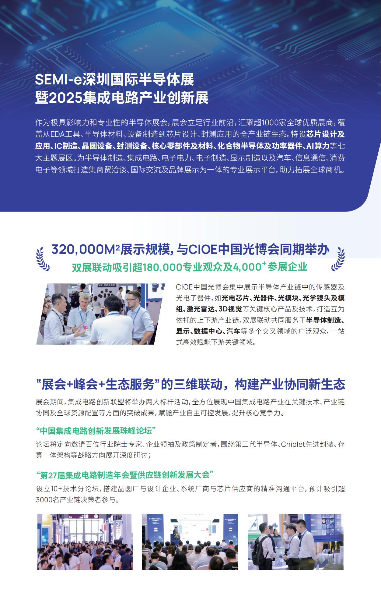 为进一步加强国际国内交流合作,展示最新科技成果,促进集成电路产业可持续健康发展,由中国国际光电博览会(简称CIOE中国光博会)与集成电路创新联盟主办,爱集微与深圳市中新材会展有限公司共同承办的“SEMI-e深圳国际半导体展暨2025集成电路产业创新展”,将于2025年9月10-12日在深圳国际会展中心(宝安)举行。