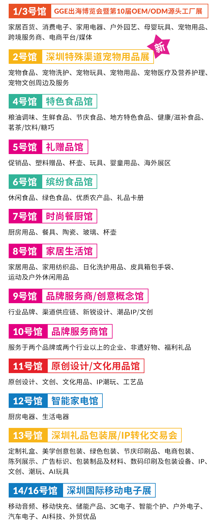 陶瓷、文具、烟具、包装、促销品、食品类、收藏品、小家电、工艺礼品、美容用品、健康用品、家庭用品、箱包、皮具、家居饰品、移动数码、文化用品、汽车用品、婴童用品、水晶、玻璃、家用纺织品、运动及户外、旅游用品、钟表、珠宝及时尚饰品。