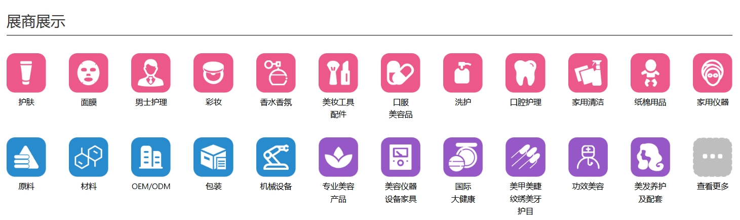 护肤、面膜、男士护理、彩妆、香水香氛、美妆工具配件、口服美容品、洗护、口腔护理、家用清洁、纸棉用品、家用仪器、原料、材料、OEM/ODM、包装、机械设备、专业美容产品、美容仪器设备家具、国际大健康、美甲美睫纹绣美牙护目、功效美容、美发养护及配套。