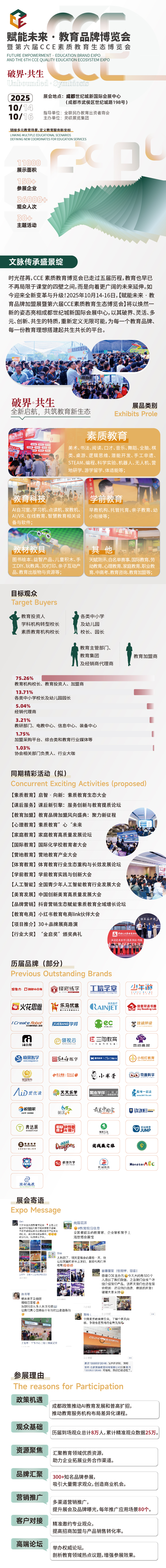 时光荏苒,CCE 素质教育博览会已走过五届历程,教育也早已不再局限于课堂的四壁之间,而是向着更广阔的未来延伸。如今迎来全新变革与升级!2025年10月14-16日,【赋能未来·教育品牌加盟展暨第六届CCE素质教育生态博览会】将以焕然-新的姿态亮相成都世纪城新国际会展中心,以其破界、灵活、多元、创新、共生的特质,重新定义无限可能,为每一个教育品牌、每一份教育理想搭建起共生共长的平台。
