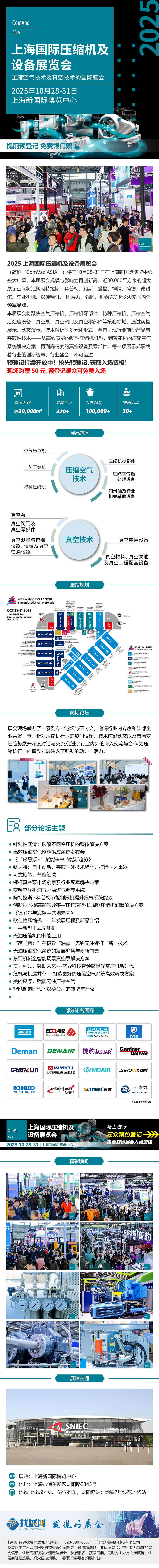 ComVac ASIA不仅是一场技术与产品的盛宴,更是一个汇聚行业智慧、洞察发展方向的战略平台。在这里,前沿科技交相辉映,创新思维激烈碰撞,共同勾勒出压缩机与真空技术产业绿色、智能、高效发展的清晰图景。诚邀全球业界同仁共赴这场年度盛会,亲临现场感受澎湃的创新脉动,把握绿色转型的时代机遇。携手并肩,以科技为笔,以合作为墨,在“双碳”目标的引领下,共同绘制压缩机与真空产业更加清洁、高效、可持续的美好未来新篇章。