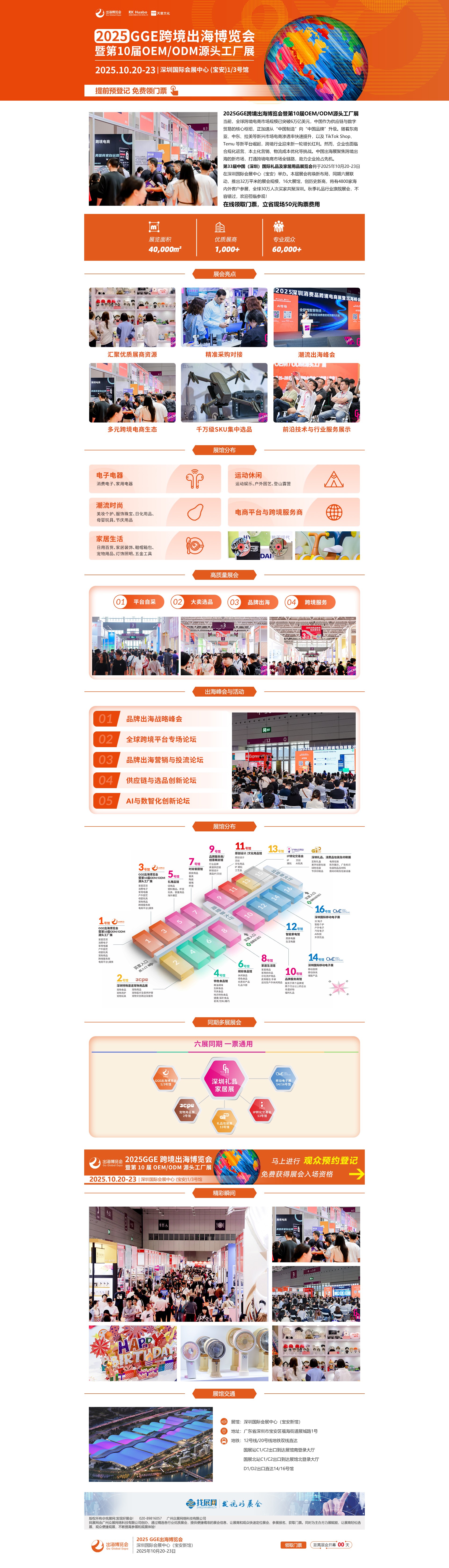 破界而生,向新而行。全球贸易新生态,从此启航。2025GGE出海博览会暨第10届OEM/ODM源头工厂展将于10月20-23日在深圳国际会展中心举办。这一盛会锚定跨境产业年度高地,成为中国制造链接全球市场的重要枢纽。 本届展会规模达30万㎡(同期举办深圳礼品展),4500+优质展商同台亮相,涵盖电子家电、家居生活、潮流时尚、户外运动等跨境全品类。 展会以“实效对接”为核心,贯穿源头企业、跨境卖家、平台与服务商全链路,形成选品更精准、撮合更高效、通路更完整的新格局。在这里,工厂直面专业买家与全球大卖,卖家把握蓝海赛道与消费热点,平台集中释放资源红利,服务商提供全流程支撑,共同开启跨境生意的新机遇。 以行业使命为驱动,以实效价值为落点,GGE出海博览会加速构筑跨境人共享机遇、汇聚资源、共创未来的全球舞台。