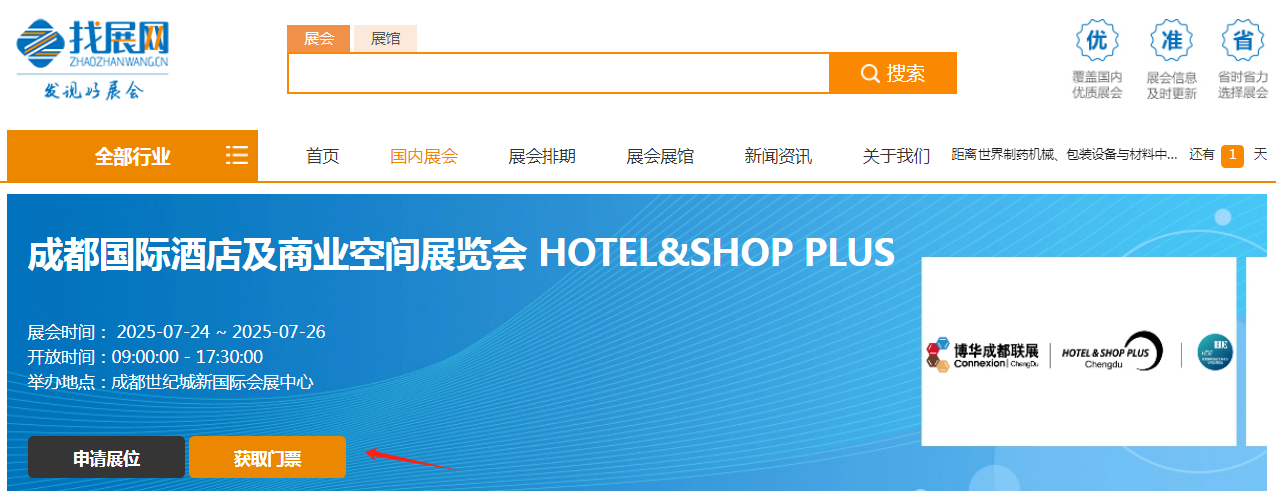 第一步,点击这里进入2025成都酒店展展会详情页,点击“获取门票”。