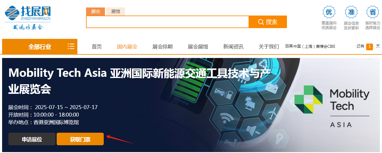 第一步:点击这里进入2025MTA亚洲国际新能源展(Mobility Tech Asia 亚洲国际新能源交通工具技术与产业展览会)详情页,点击“获取门票”。