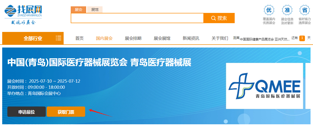第一步:点击这里进入2025青岛医疗器械展(中国(青岛)国际医疗器械展览会)详情页,点击“获取门票”。