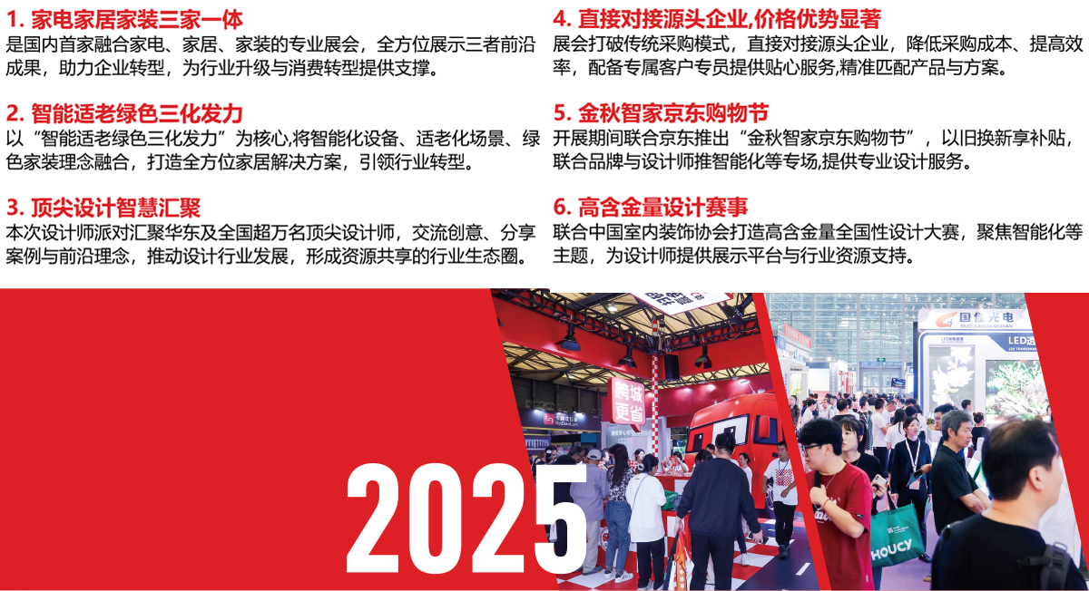 10月10日至12日,由中国五金制品协会、中国室内装饰协会、北京舜联科技有限公司联合主办的2025上海国际智家生活博览会将于上海新国际博览中心举办。家居家电家装智能化、一体化的趋势日益明显,市场结构和产品需求也随之发生了深刻变化。为更好引领行业企业顺应人工智能发展大潮,反映行业发展趋势,满足消费者对智能生活的期待,展会主办方应广大行业同仁要求,决定将原“中国国际厨卫家居博览会”与“人工智能应用及产业生态博览会”融合升级为“上海国际智家生活博览会”。