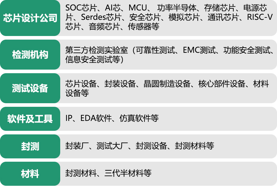 SOC芯片、AI芯、MCU、功率半导体、存储芯片、电源芯片、Serdes芯片、安全芯片、模拟芯片、通讯芯片、RISC-V芯片、音频芯片、传感器等。