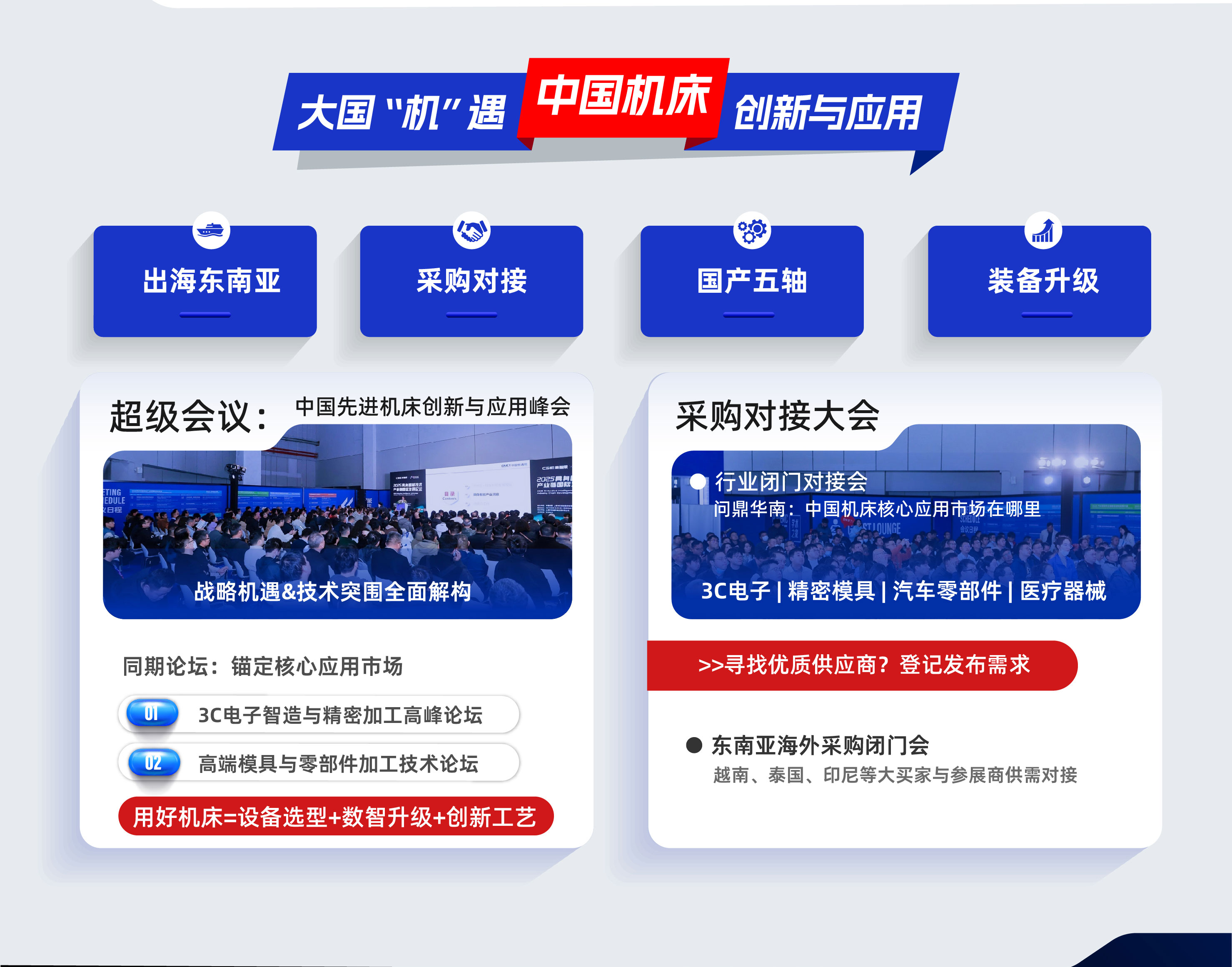 2025东莞国际机床展聚焦4大应用,聚焦行业精密零件加工,重点锚定3C电子、精密模具、汽车零部件、医疗器械等行业零件加工场景,致力于助力机加工朋友突破高精、高效等加工困局。