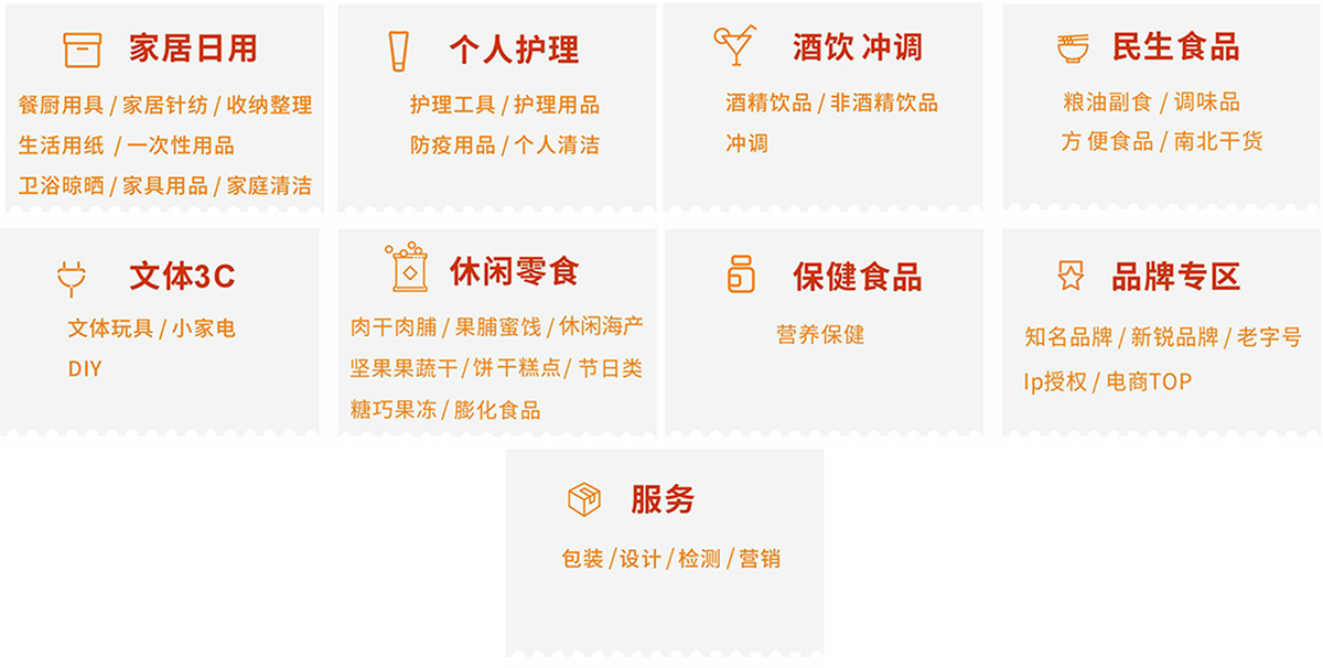 家居日用:餐厨用具、家居针纺、收纳整理、生活百货、一次性用品、卫浴零配、家具用品、家庭清洁、文体玩具、DIY、小家电、季节性用品